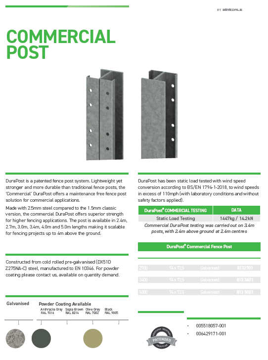 Like the Classic, Commercial DuraPost have been tested to wind speeds in excess of 100mph and carries a guarantee of up to 25 years.